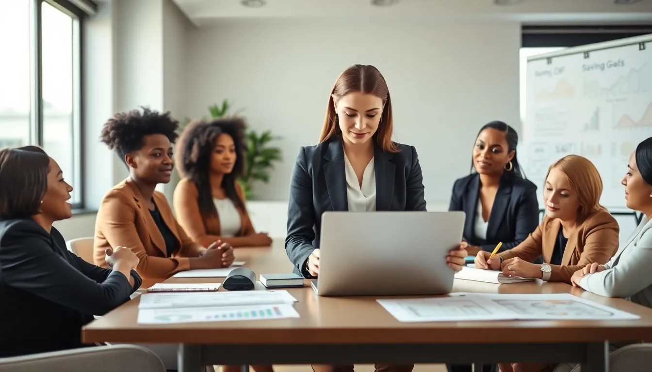 professionals discussing financial goals in a modern office setting.